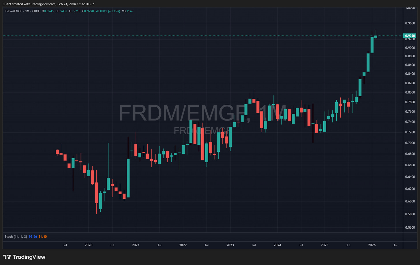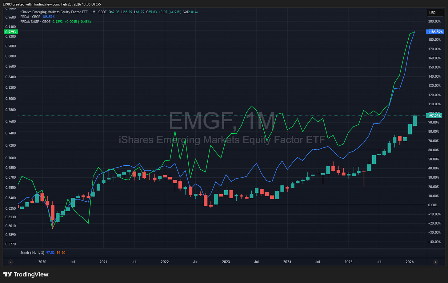 EMGF and FRDM have similar charts showing a breakout, but layering them produces the same chart.
