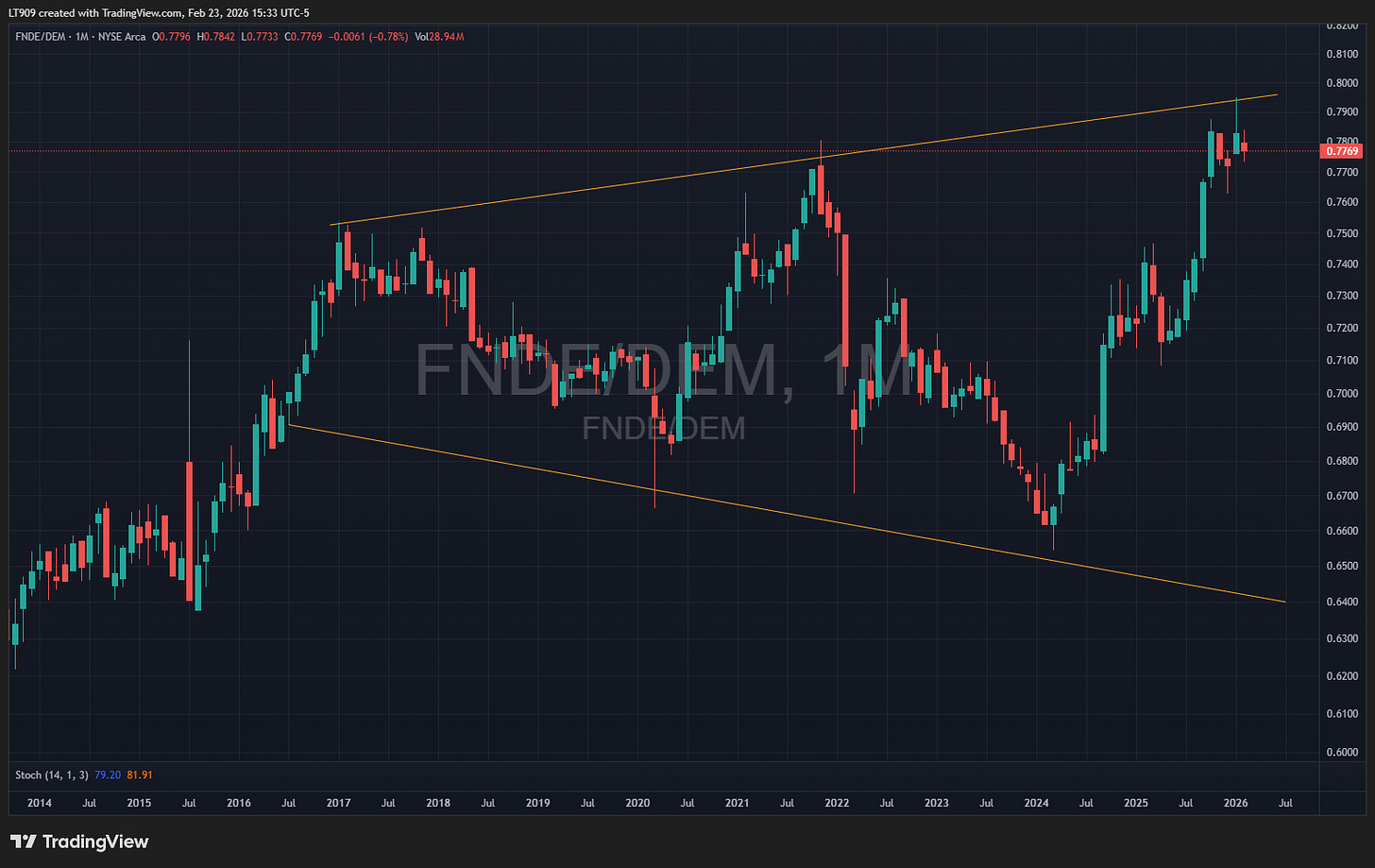 FNDE looks like it might be headed for underperformance versus DEM, but here it pays to look ahead a bit. DEM is more stable because it owns big dividend payers like state-owned banks and telecom. It holds up in bear markets. FNDE is better suited for an EM bull though. The case for picking DEM over FNDE is more of a meta question, in that we probably want to hold cash and wait for a better buy in everything if DEM is set for leadership.