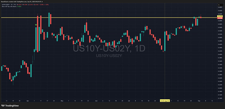 There’s rumor about Friday’s job report being poor. If so, aside from direct impact via likely selling (based on the August 1 reaction to jobs revision), it would also likely steepen the yield curve, making for bearish implications all around.