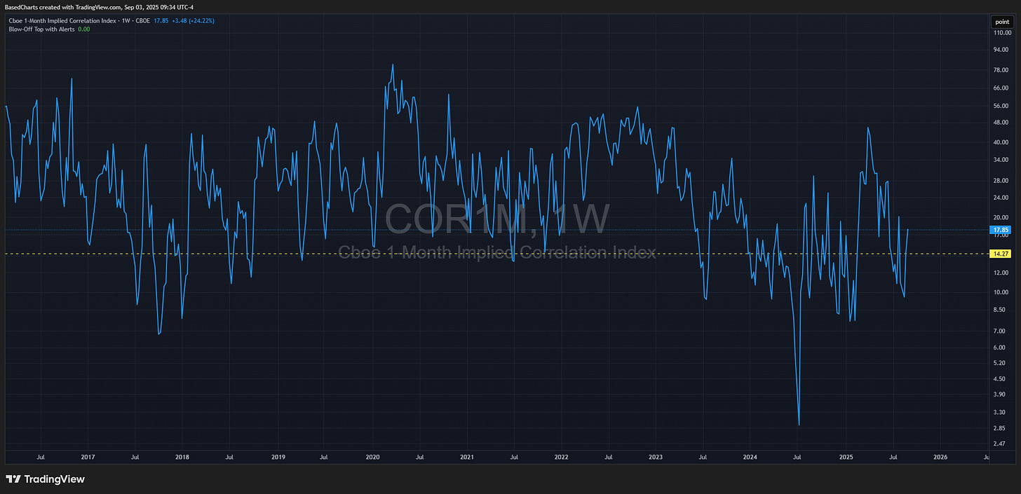 Best case for bulls, assuming a top is coming, remains “the pause that refreshes.” Implied correlation spiked, clearing the way for the market to ramp to another plunge setup. The market isn’t at the bleeding edge of technicals screaming top, but it has kept returning there as indexes grind higher. A final top could be one final insane spike that nobody can miss, or it will be a quiet one that will only be realized in hindsight.