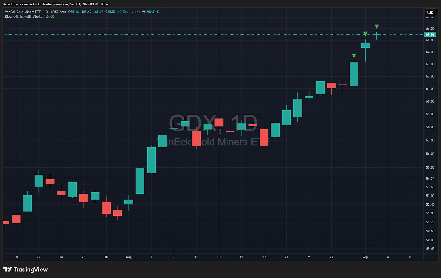 As for precious metals, the miners at least are starting to look exhausted. Melt-up mania moves if it keeps running, but more likely a pullback is imminent. It could be a pause that refreshes or part of a larger financial market correction should stocks tumble.