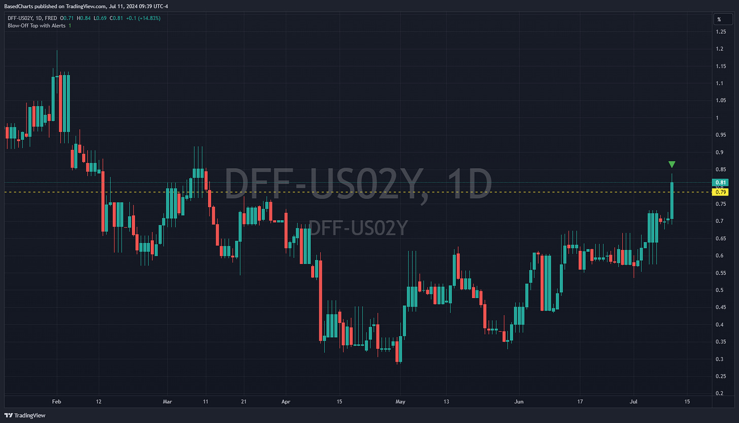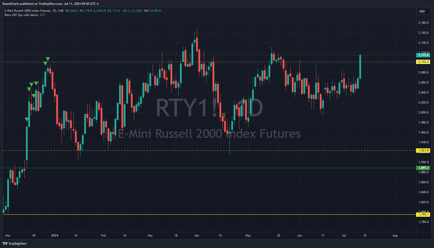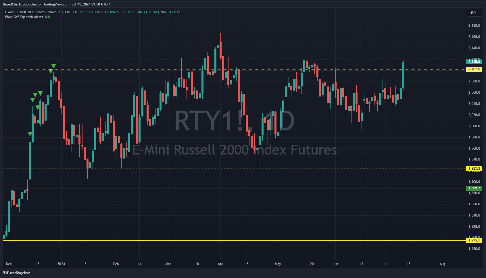 Small-caps have performed terribly with high interest rates and are spiking on the news that it’s rate cutting time. I don’t know how long this phase will last. The Fed started cutting in the summer of 2007 and the market didn’t top for a couple of months. RTY should outperform in this bullish window. It could shut tomorrow for all we know. For now, I’m assuming this is short-covering, but not shorting it yet.