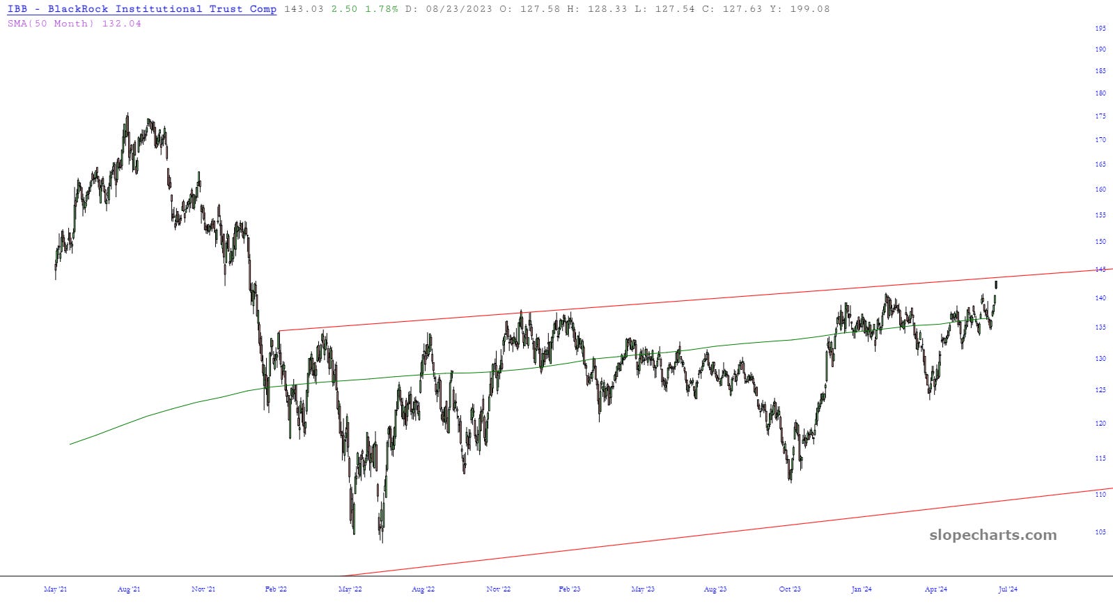 Lilly lost the daily signal at the morning low. If it falls below $930 it should go off. This one has been very stubborn. XLV might be a good short up here if it cannot make a new high. Since it is considered defensive, and both JNJ and UNH sport huge bearish topping patterns, it could catch a bid from long-only managers looking for hiding spots. XBI and IBB gapped up too, with IBB making a new 52-week high. There’s certainly chart potential for gains here, but need to see more.