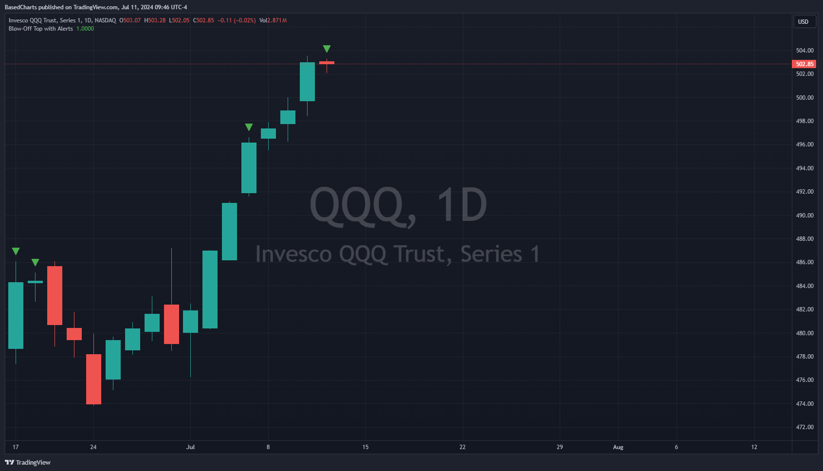 QQQ and NQ both have blow-off top signals ON today, despite being red. This signal will not hold into the close if losses mount. The weekly is still on.