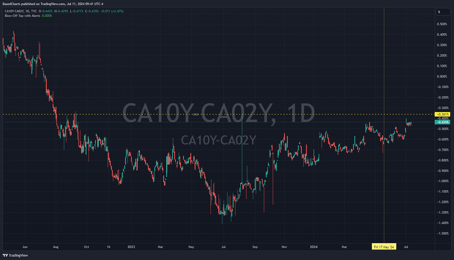 This signal did not stick. It might have been bad data, a glitch by the site or a brief divergence between the two interest rates. When this breaks out, The Steepening will be underway in Canada.